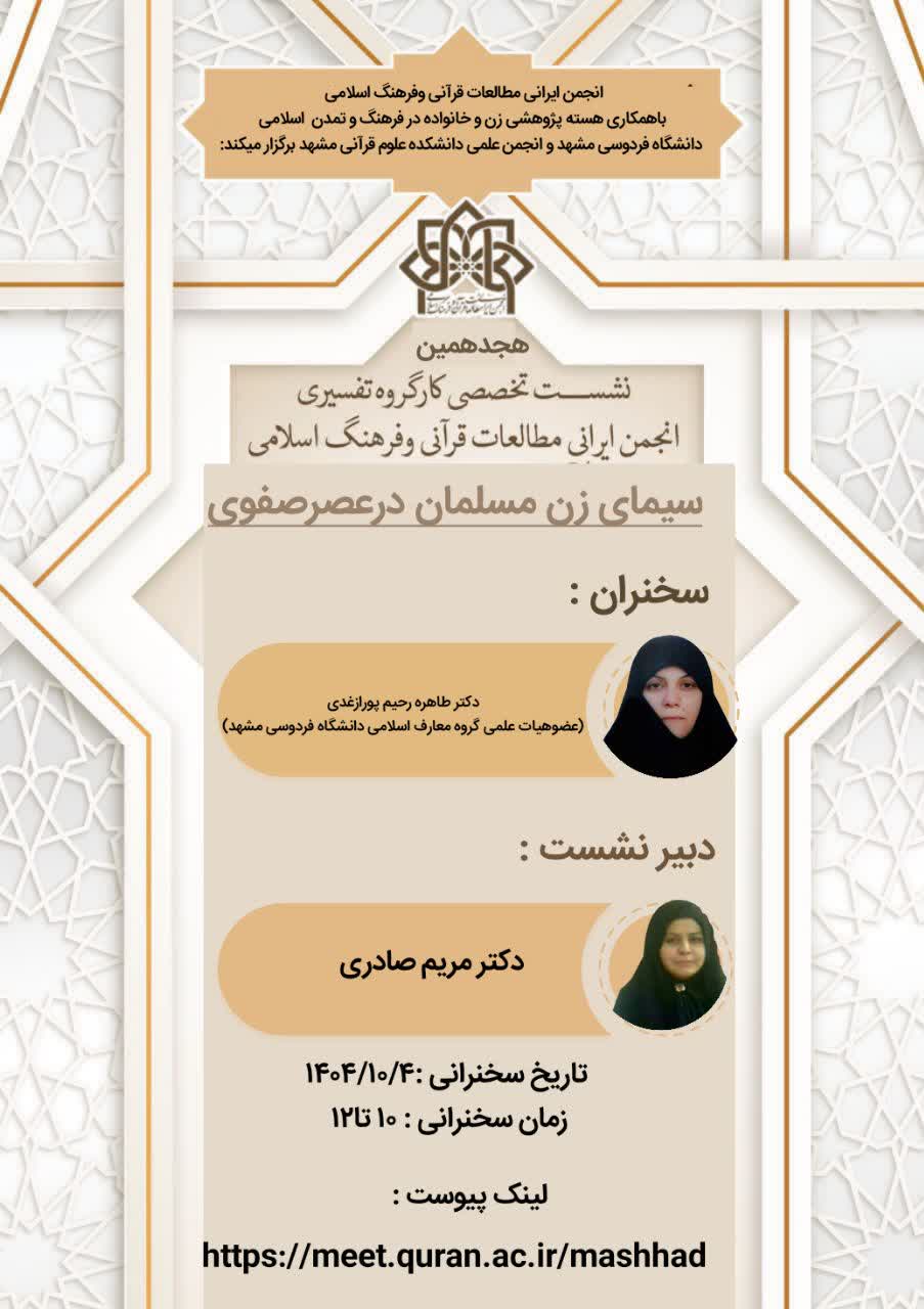 انجمن ایرانی مطالعات قرآنی و فرهنگ اسلامی باهمکاری هسته پژوهشی زن وخانواده درفرهنگ وتمدن اسلامی دانشگاه فردوسی مشهد وانجمن علمی دانشکده علوم قرآنی مشهد برگزار می کند: